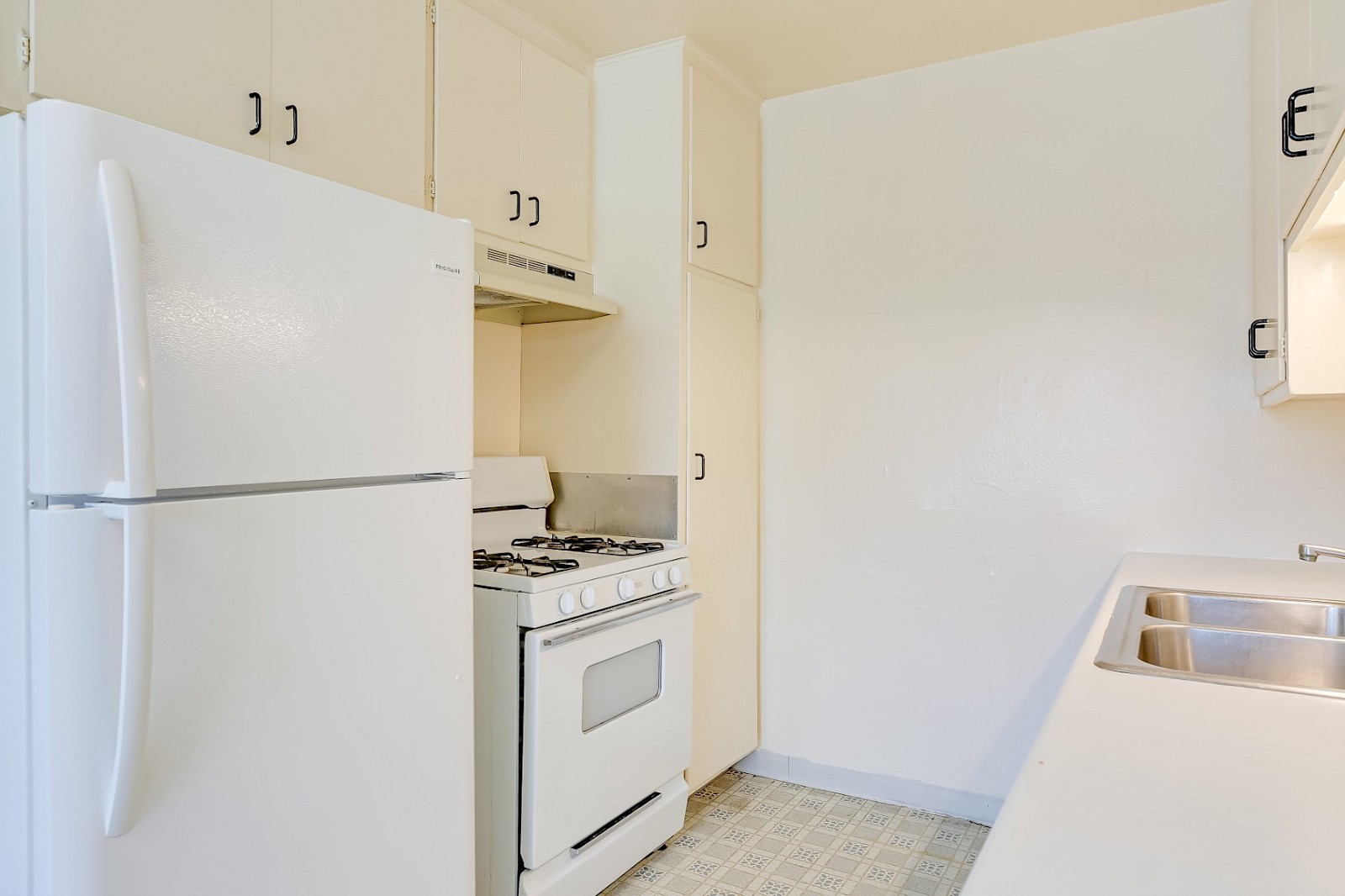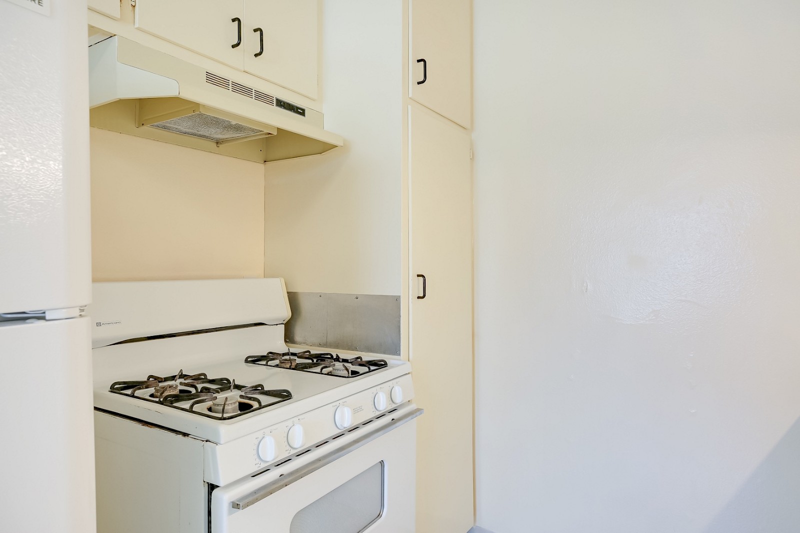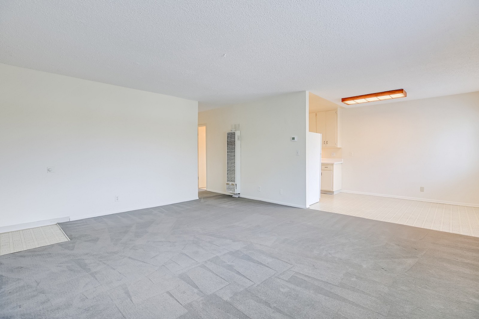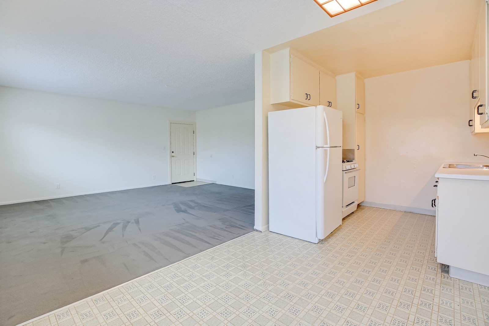 The large living space is bright and airy, and leads to a separate, full kitchen includes that cabinets with ample storage space, garbage disposal, gas range, and refrigerator.