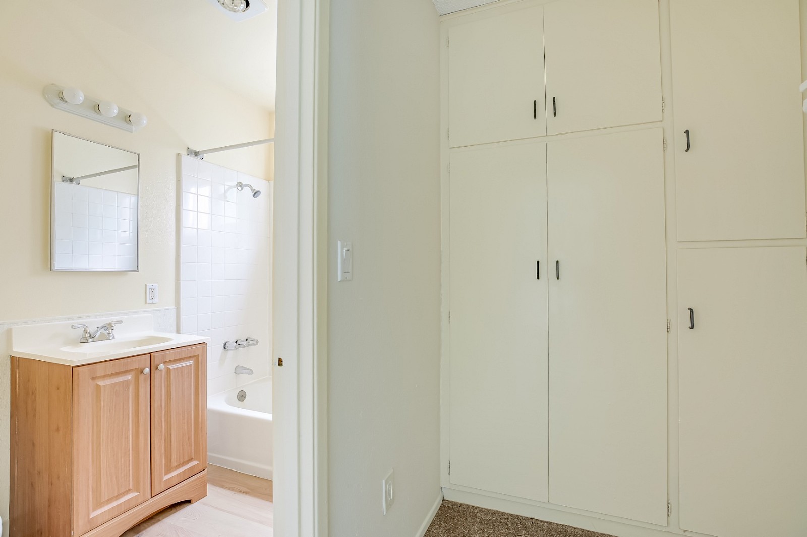 Large walk in closet with cabinets in hallway provide great storage space. Bathroom feature shower/bathtub.