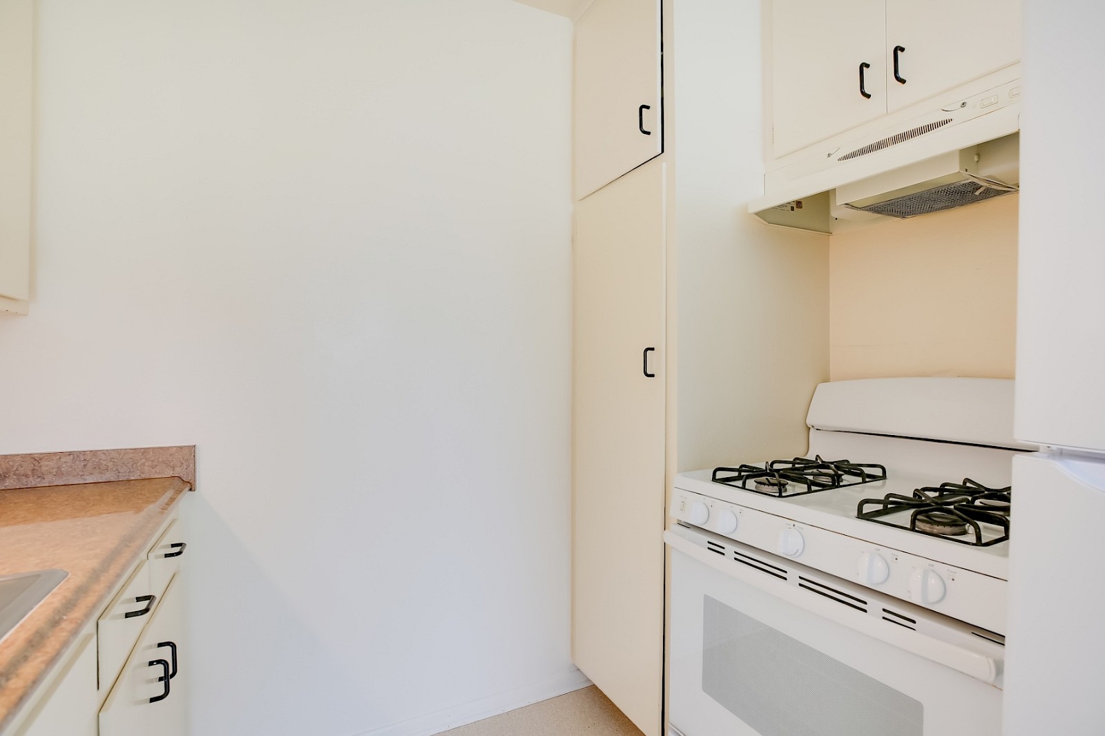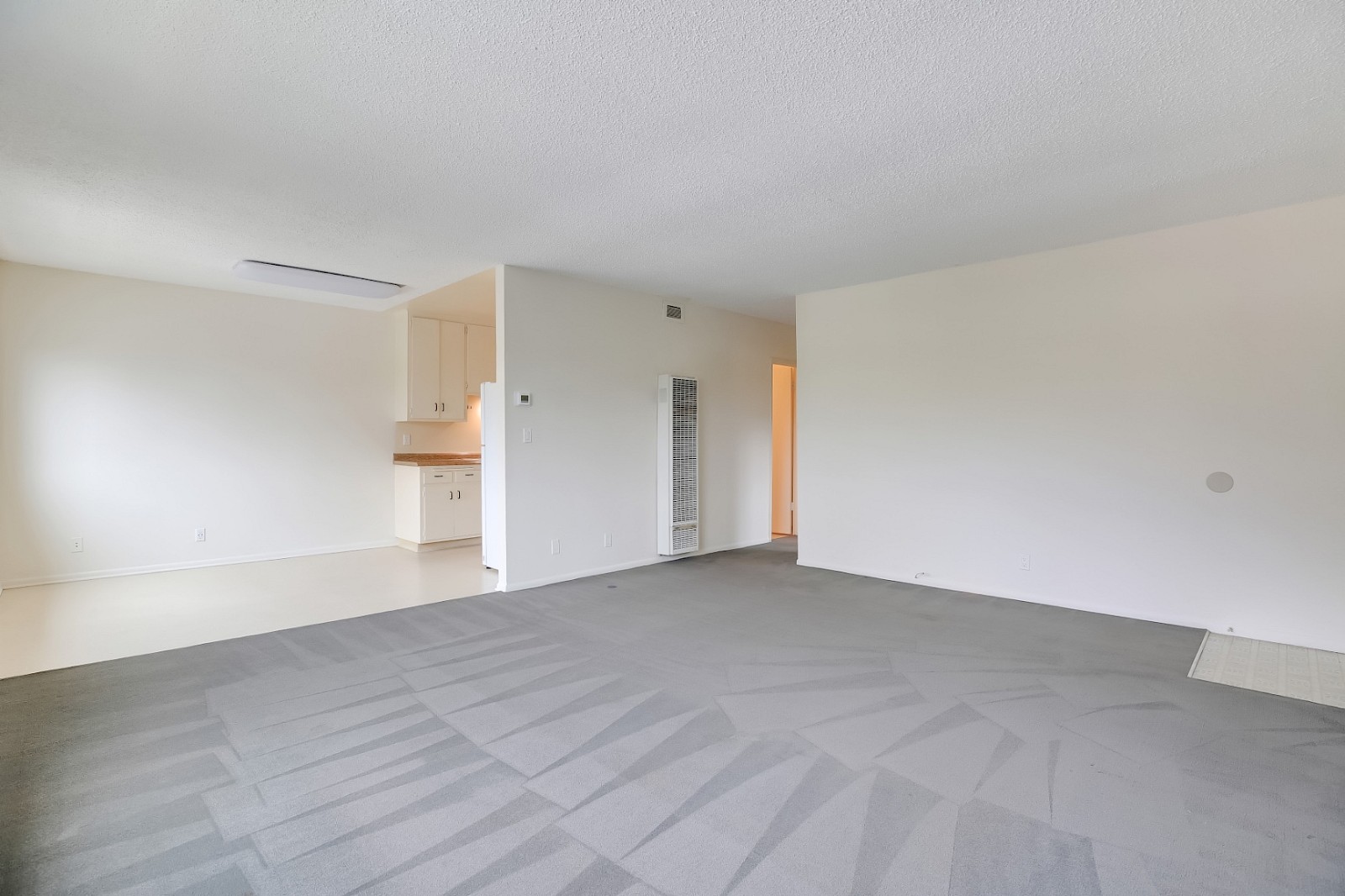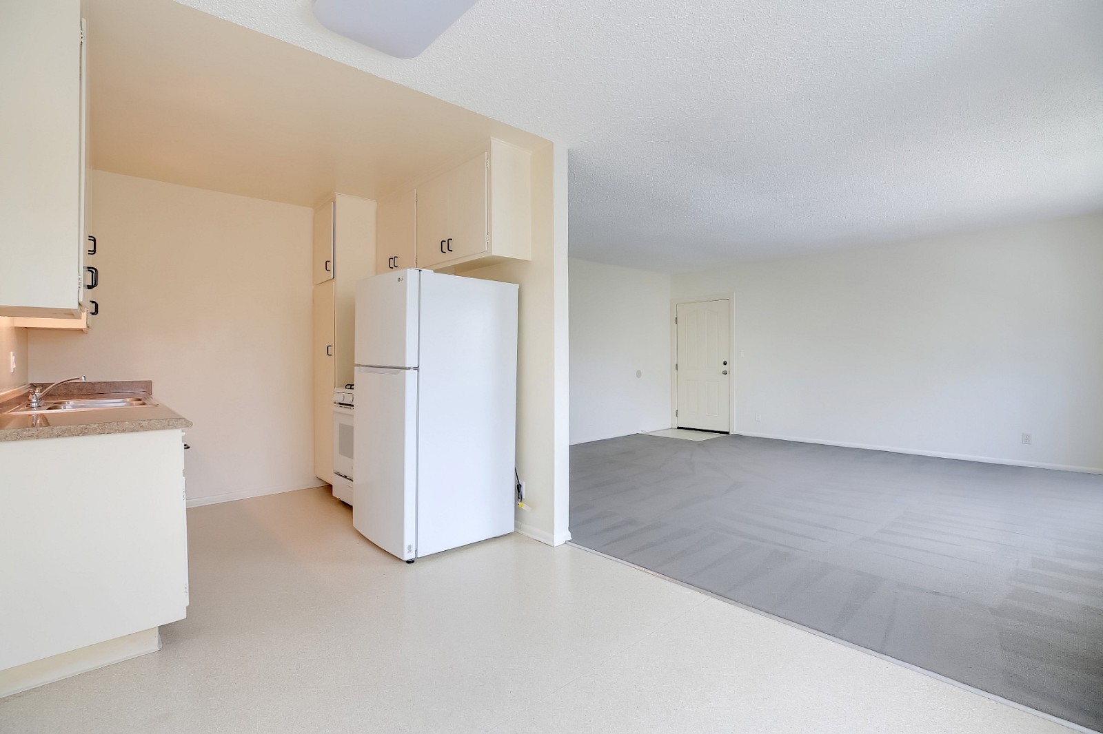 The large living space is bright and airy, and leads to a separate, full kitchen includes that cabinets with ample storage space, garbage disposal, gas range, and refrigerator.