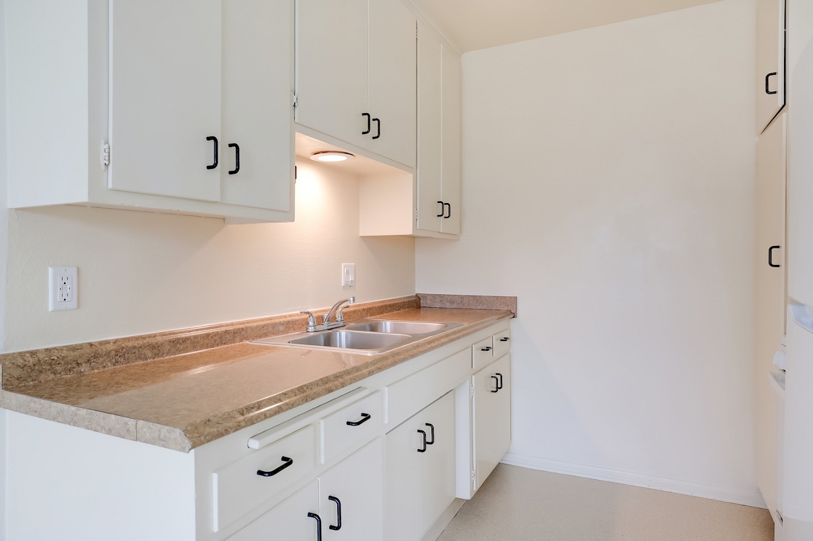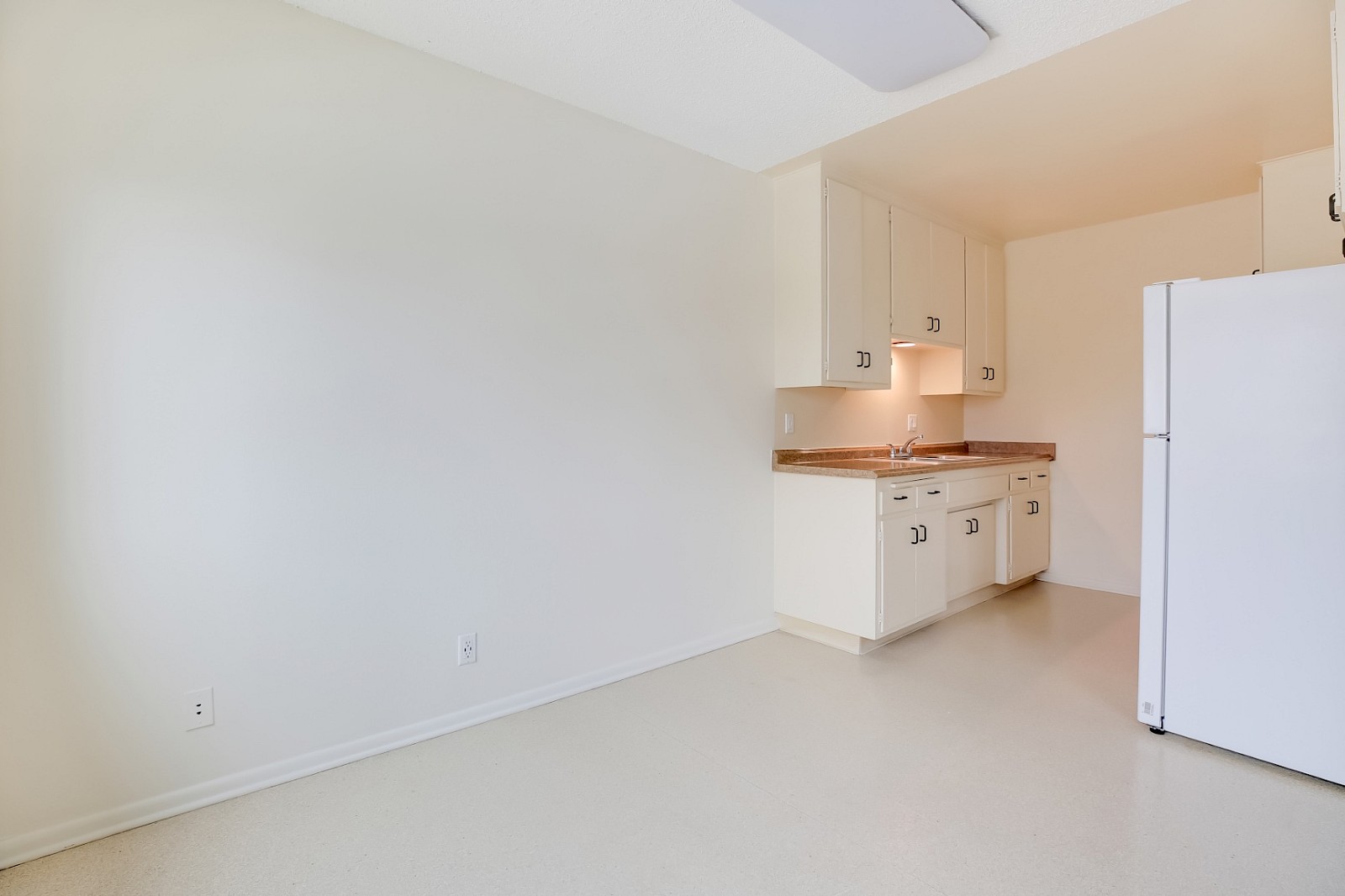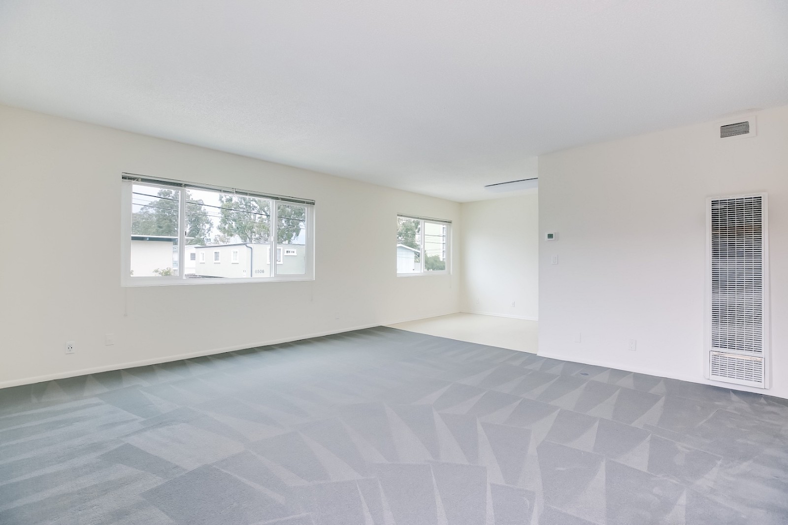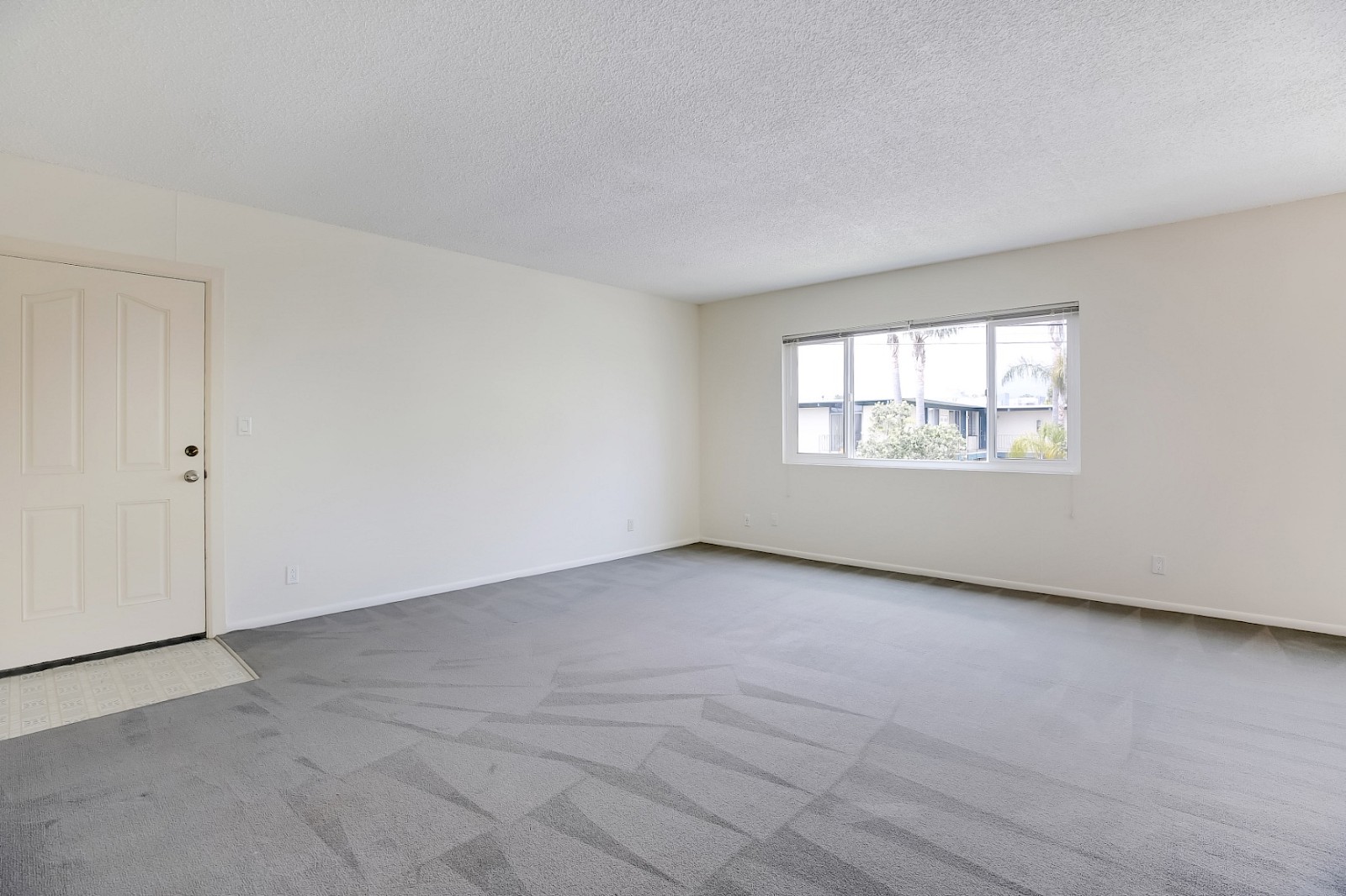 The large living space is bright and airy, and leads to a separate, full kitchen includes that cabinets with ample storage space, garbage disposal, gas range, and refrigerator.