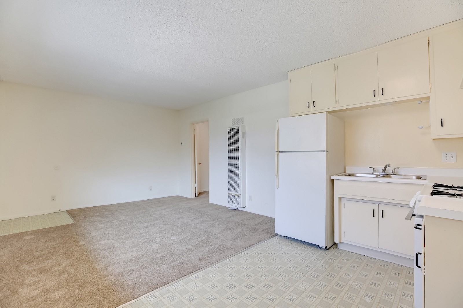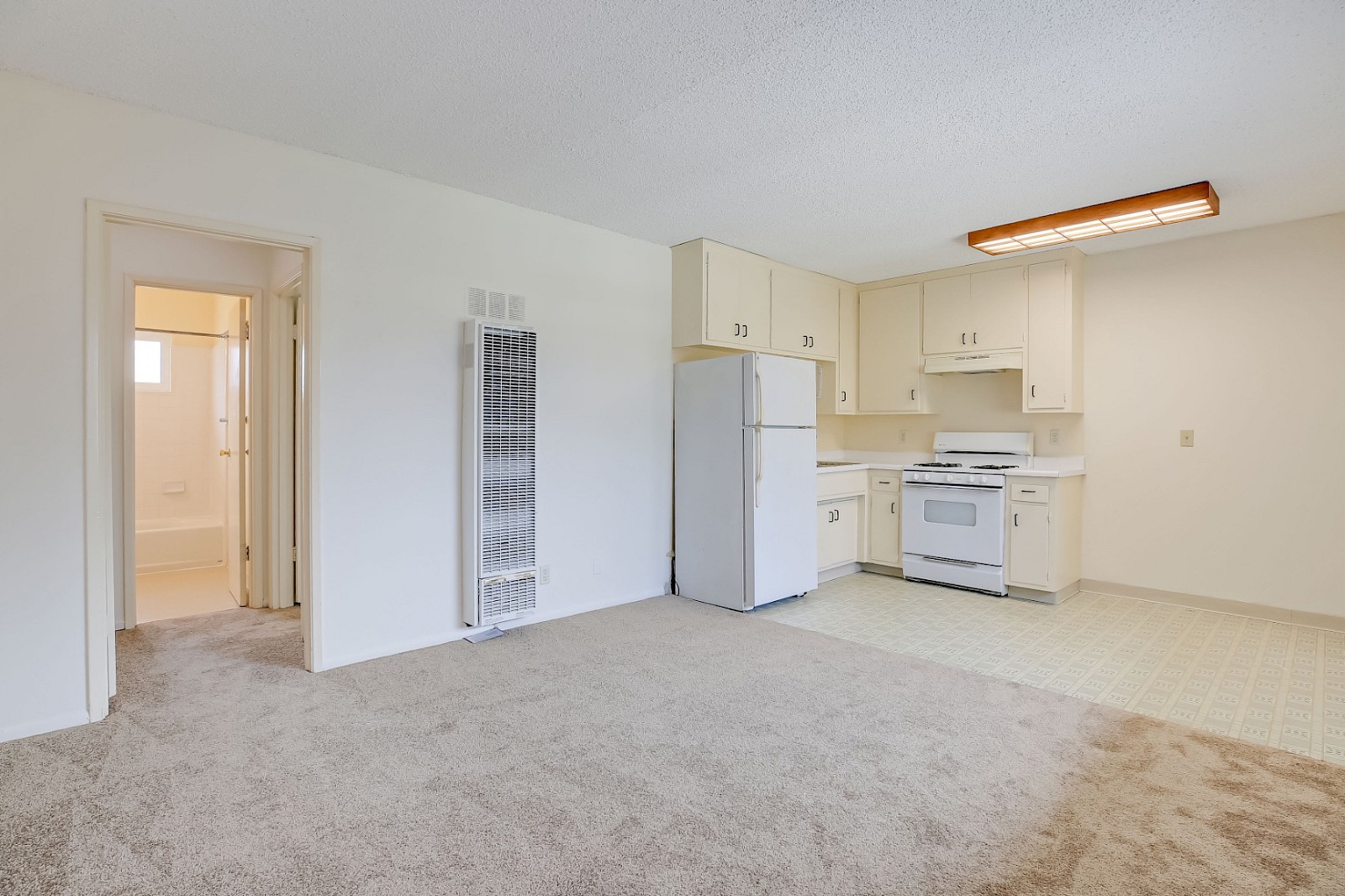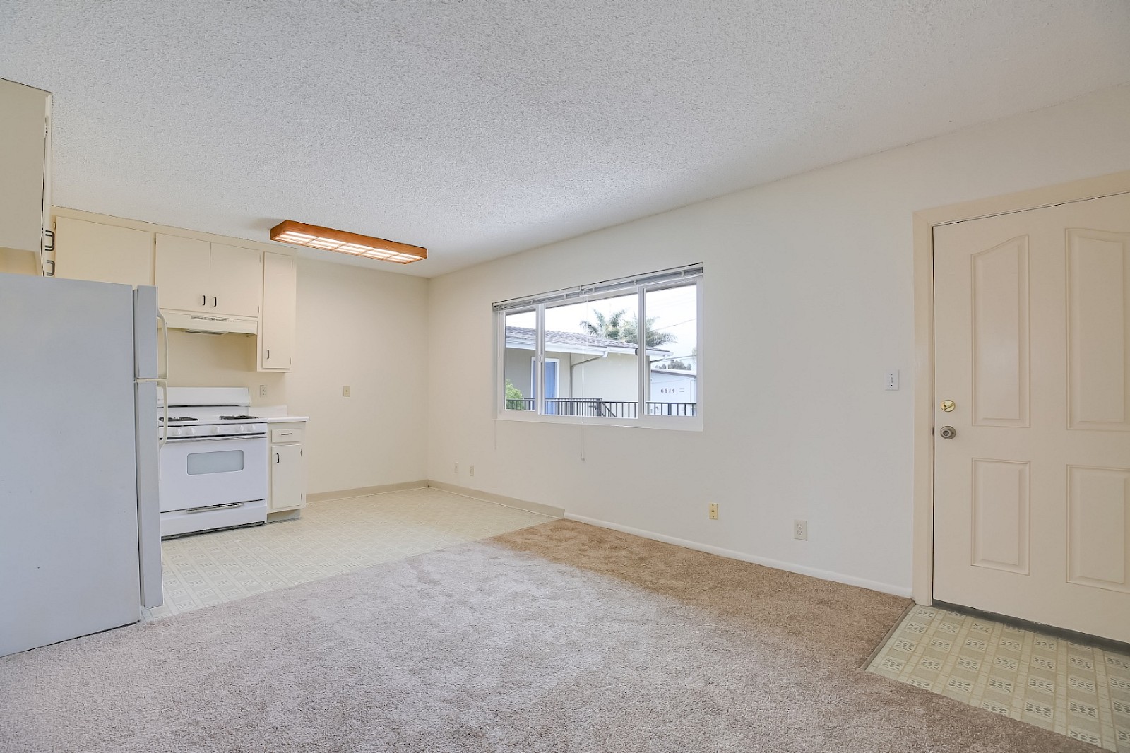 The large and open living room is bright and airy, and leads to a separate, full kitchen includes that cabinets with ample storage space, garbage disposal, gasrange, and refrigerator. Dining area is set into the kitchen.