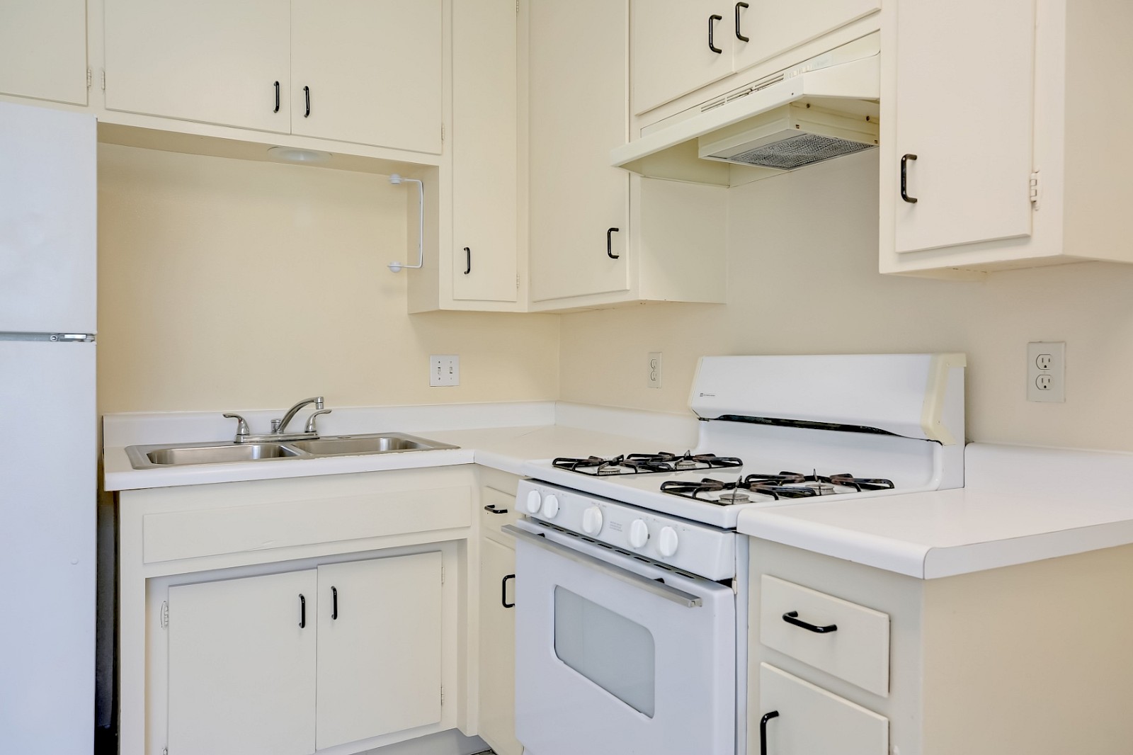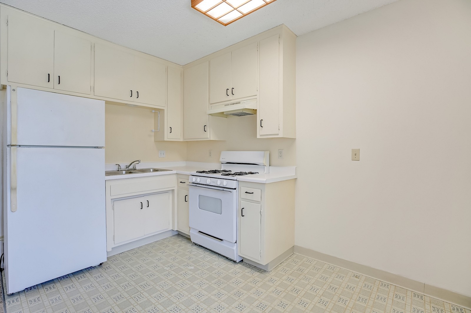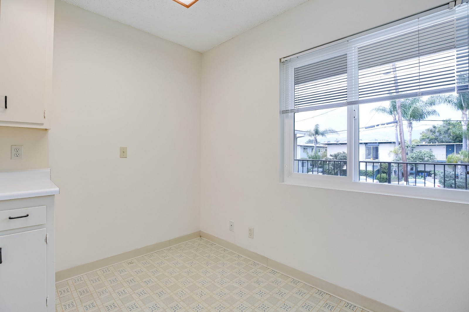 The large and open living room is bright and airy, and leads to a separate, full kitchen includes that cabinets with ample storage space, garbage disposal, gasrange, and refrigerator. Dining area is set into the kitchen.