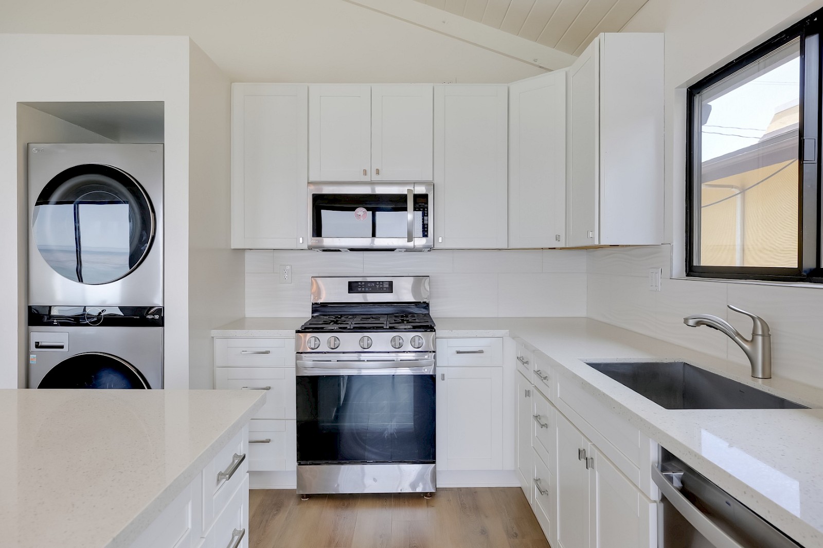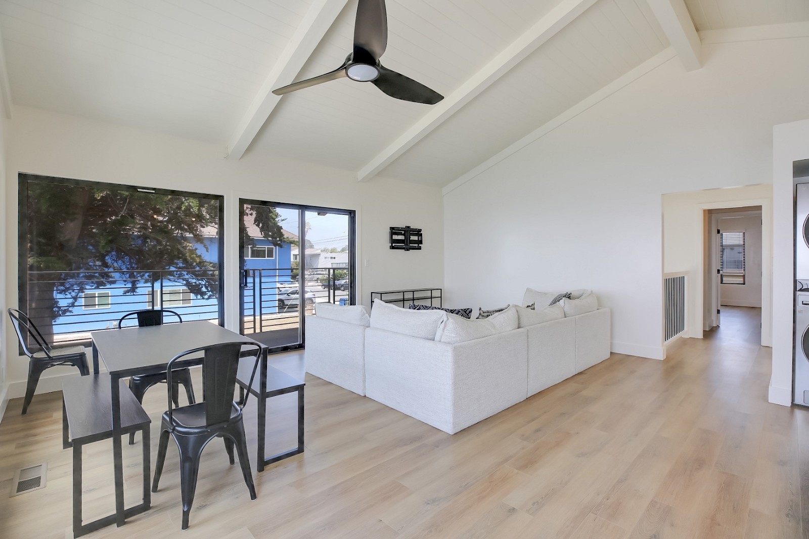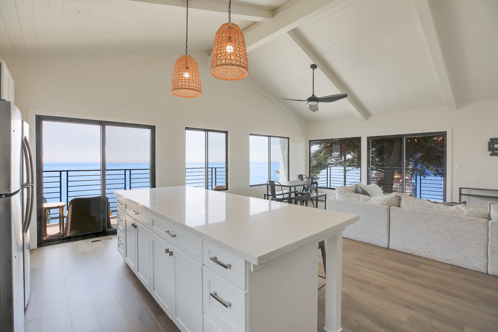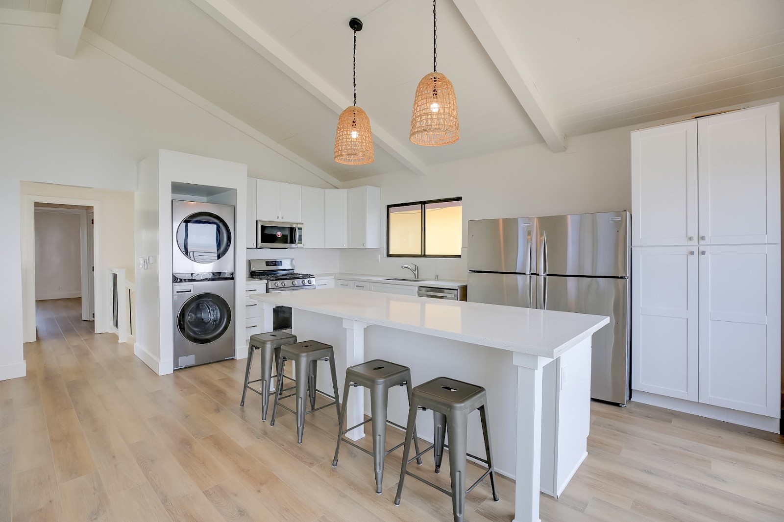 New hardwood flooring throughout give this house modern beach vibes! Upstairs is a huge living room with 2 sliding doors leading to decks overlooking the beach. A large ceiling fan provides even more air than the already wonderful ocean breeze. Open concept kitchen features stainless steel fridge, gas range, stacked laundry, beautiful new countertops and island. There is plenty of cabinet space and room for everyone to prepare meals.