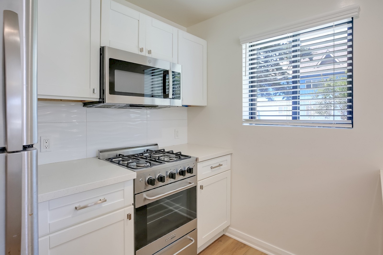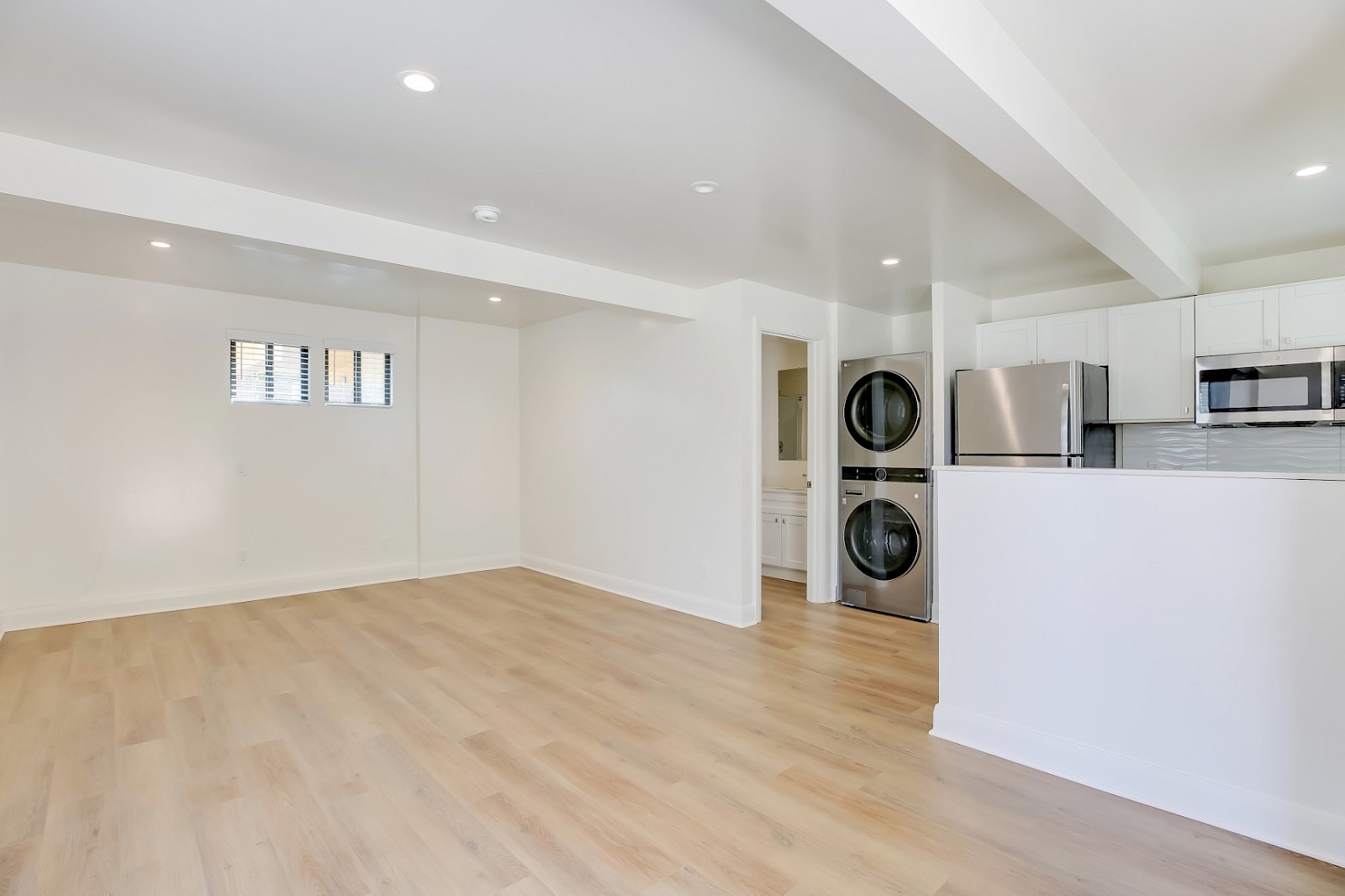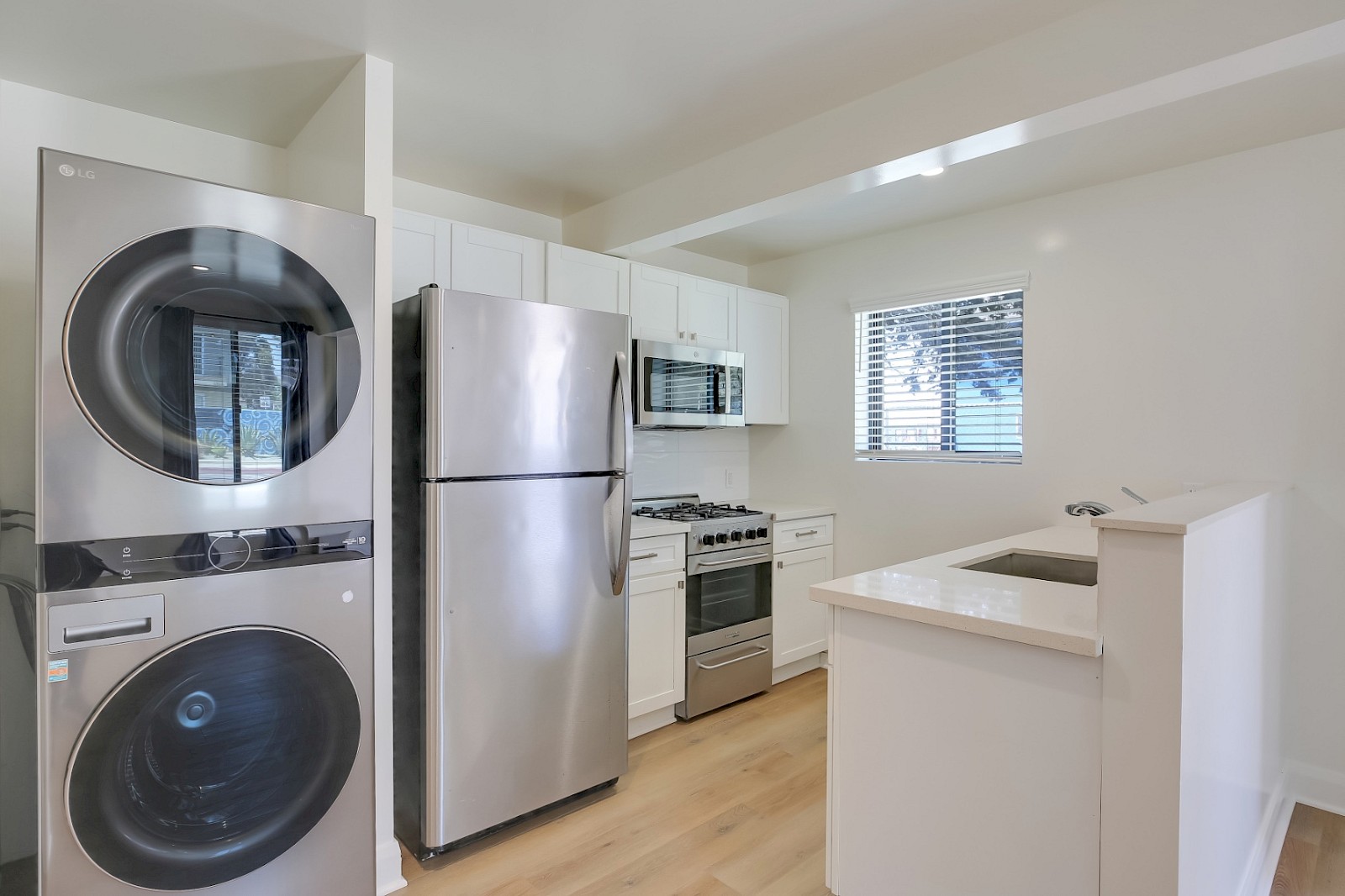 This studio boasts a full kitchen with stainless steel appliances, including a gas range and stacked laundry machines.