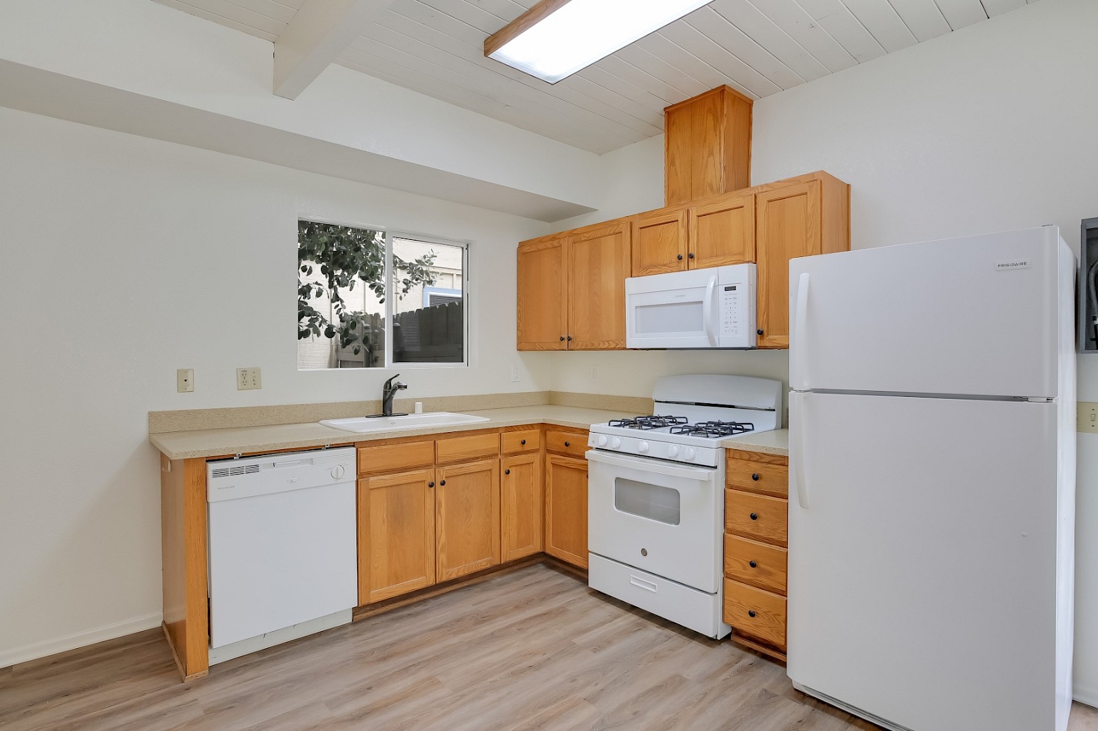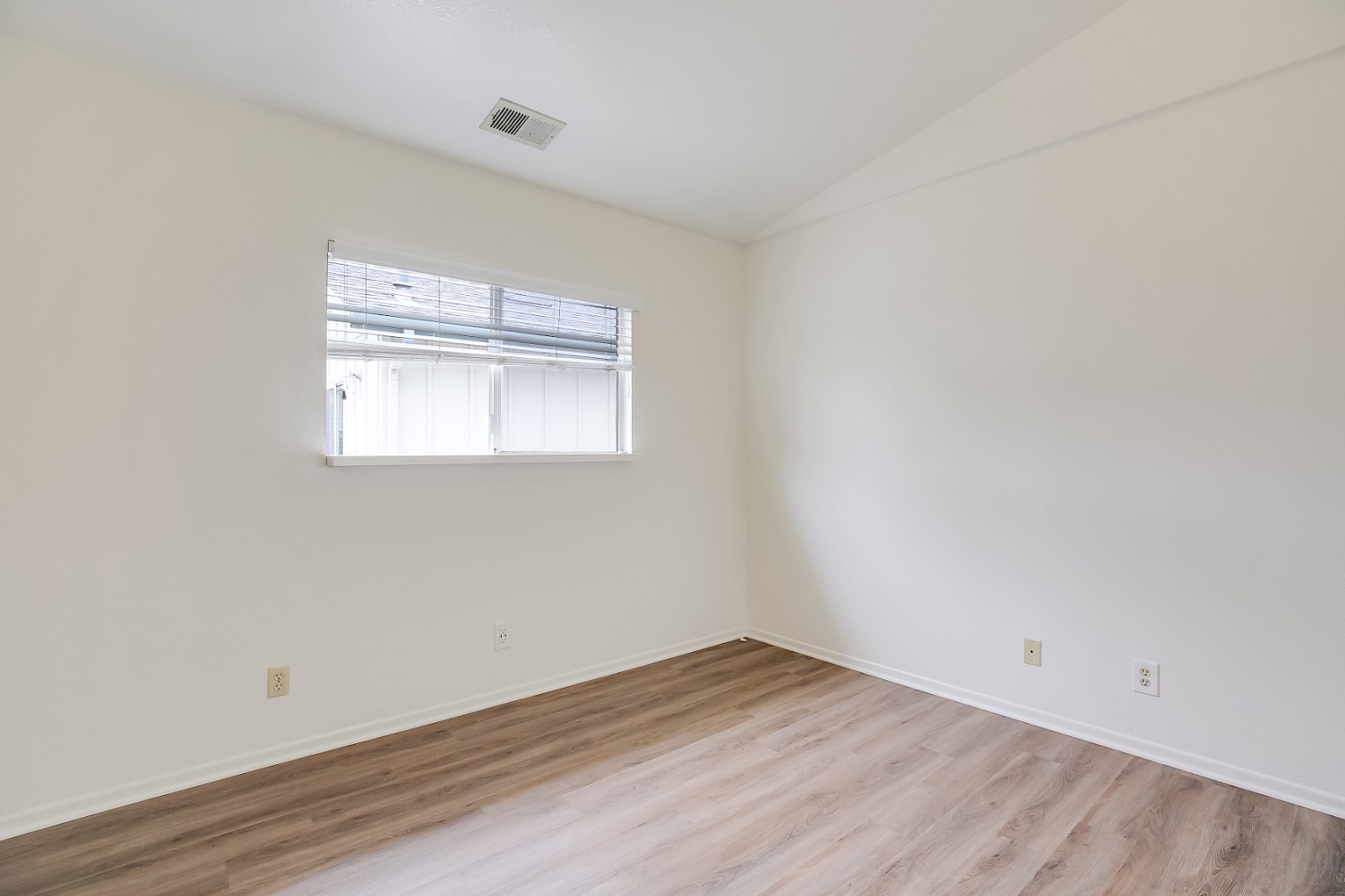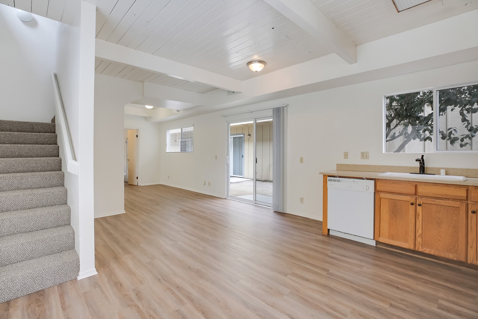 The large bedrooms boast ample closet space. The downstairs has a large living room that opens to a side yard, and connects to the kitchen. . The kitchen includes a dishwasher, refridgerator, microwave, and gas range.