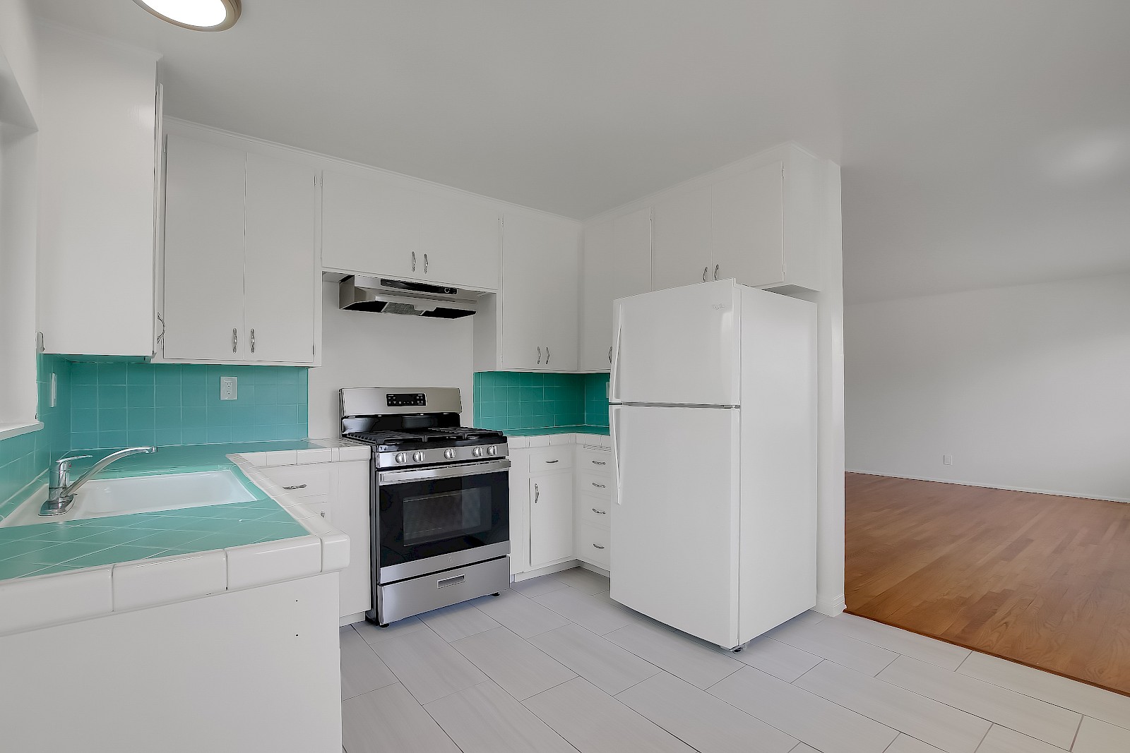 Both bedrooms have ceiling fans and closets with new mirrored closet doors. There is also closets in the living room and hallway to provide ample storage space. The bathroom has a tile surround shower and large double vanity. The kitchen includes a refrigerator, gas range, as well as a dining area with window, a great breakfast spot.
