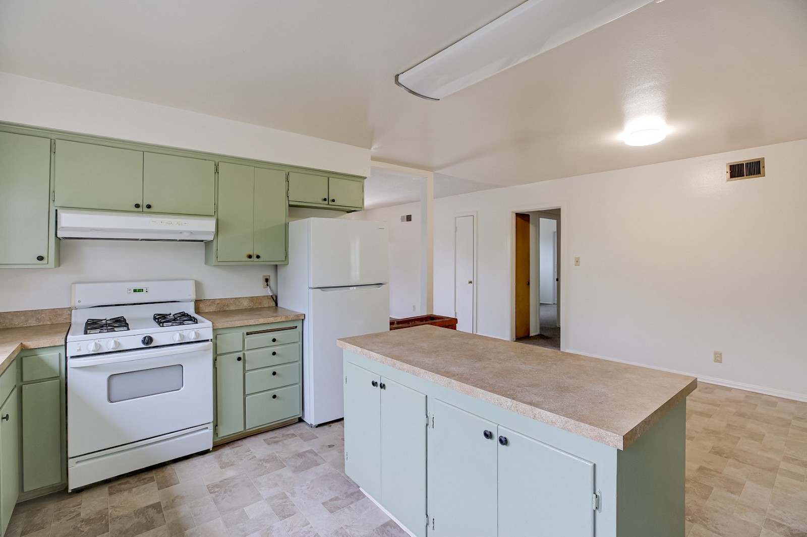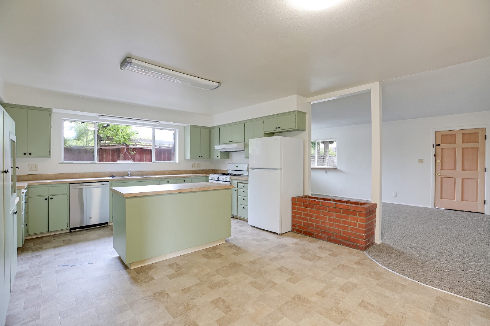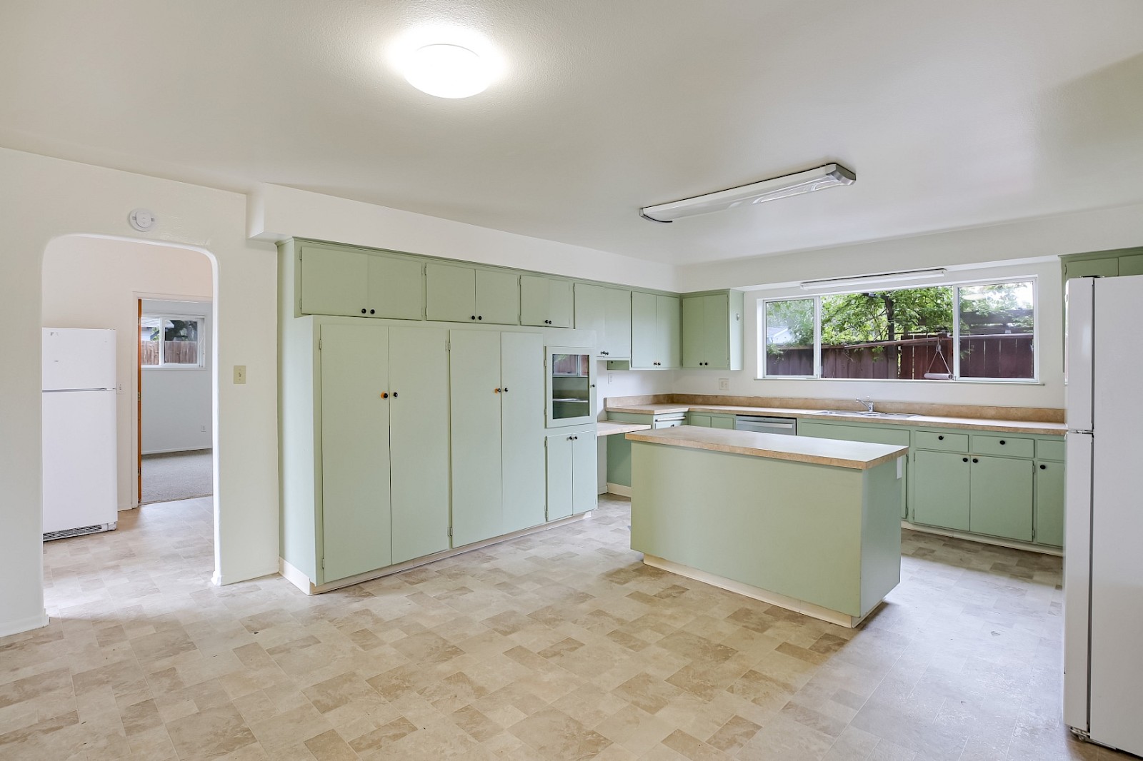 The newer. open kitchen features 2 refridgerators, a gas range, and a dishwasher.
